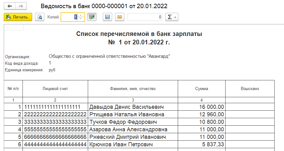 Проведем документ. Выведем на печать список перечисленных сумм.