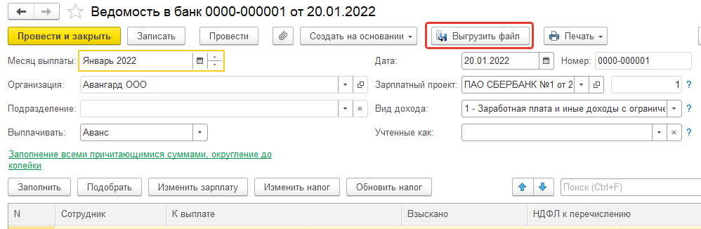 1. Создадим в разделе "Выплаты / Все ведомости" ведомость на выплату аванса через банк для ООО "Авангард": укажем дату документа 20.01.2022, выплата за январь 2022г., по зарплатному проекту Сбербанка, вид дохода 1. Заполним документ автоматически списком сотрудников, у которых открыты лицевые счета по зарплатному проекту.