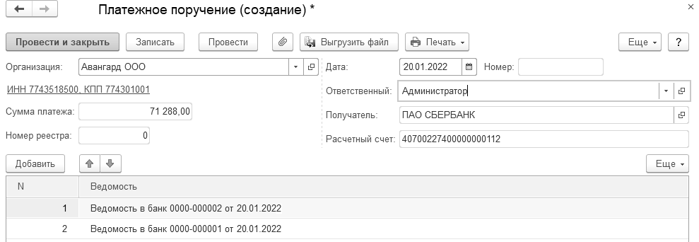 Если в программе используется встроенный электронный обмен с банком и соответствующая настройка выполнена в справочнике по зарплатным проектам, то в ведомостях на выплату появляется кнопка "Выгрузить файл".