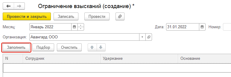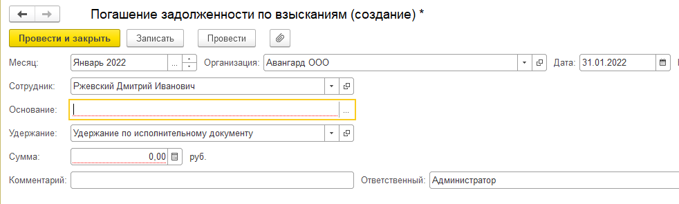 · "Результат" - заполняется с учетом заданной для исполнительных листов очередностью, в соответствии с законодательством и задолженности по взысканиям за прошлые периоды. После проведения документа именно суммы из этой колонки становятся фактически удержанными у сотрудника, а всё, на что зарплаты уже не хватило – откладывается в задолженность на следующие периоды.